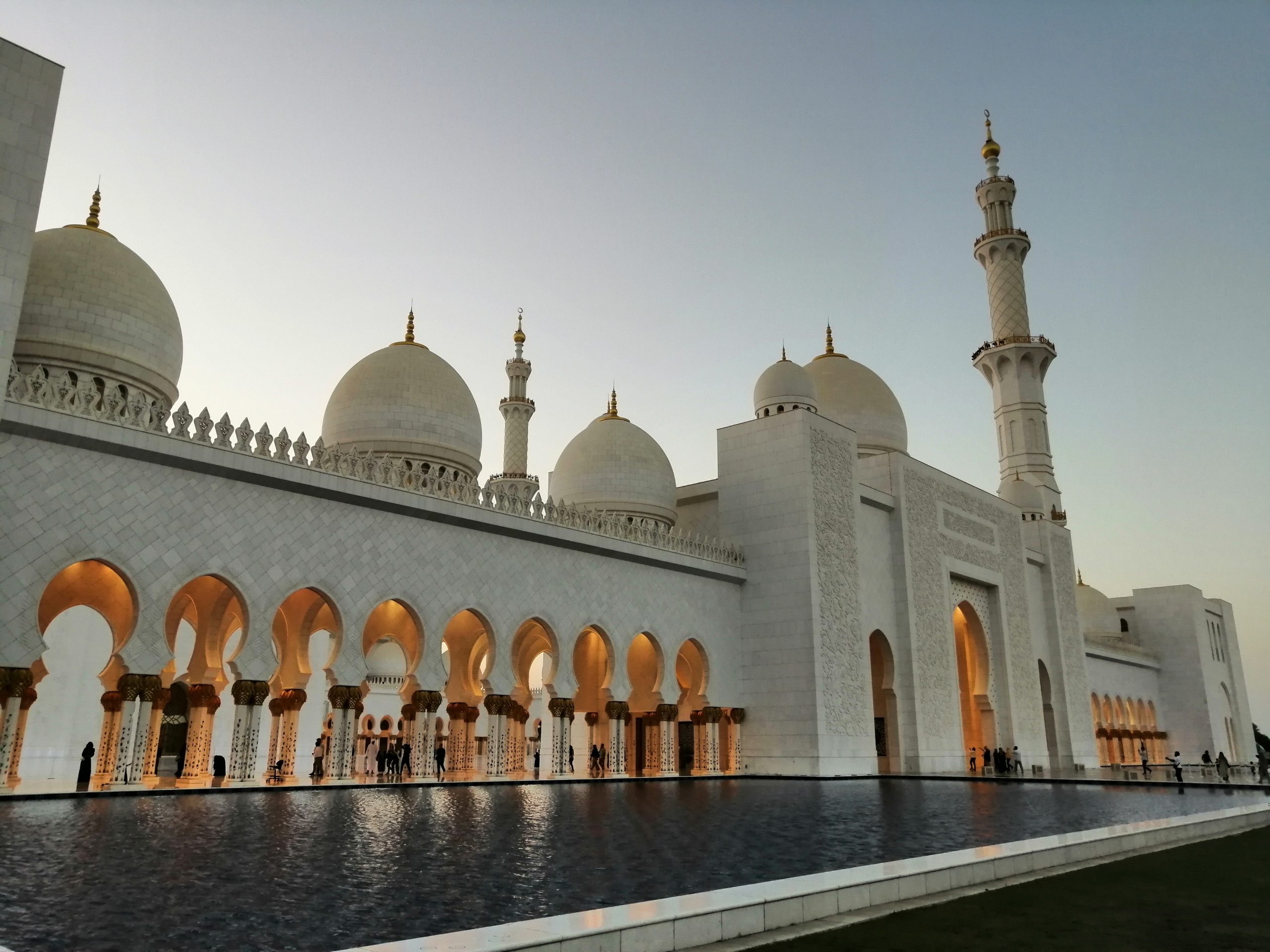 Stamtąd niedaleko było już do Wielkiego Meczetu Szejka Zajida, do którego jednak trzeba było podjechać taksówką, bo innej możliwości nie było. Na samym wjeździe spotkała nas niespodzianka, ponieważ wokół meczetu przeleciało kilka samolotów wypuszczając za sobą kolorowe smugi w barwach Emiratów. Dzień wcześniej odwiedziliśmy meczet w Muscacie i wydawało nam się, że jest olbrzymi, ale przy tym w Abu Dhabi był wydawał się niewielki. Wejście do niego było przez podziemne przejście w galerii handlowej. Należało pobrać wejściówkę – wcześniej przez internet albo na miejscu. Wędrówka długimi korytarzami, kontrola stroju i bagażu, a potem jeszcze długi przejazd ruchomymi chodnikami i w końcu lądujemy na dziedzińcu meczetu.